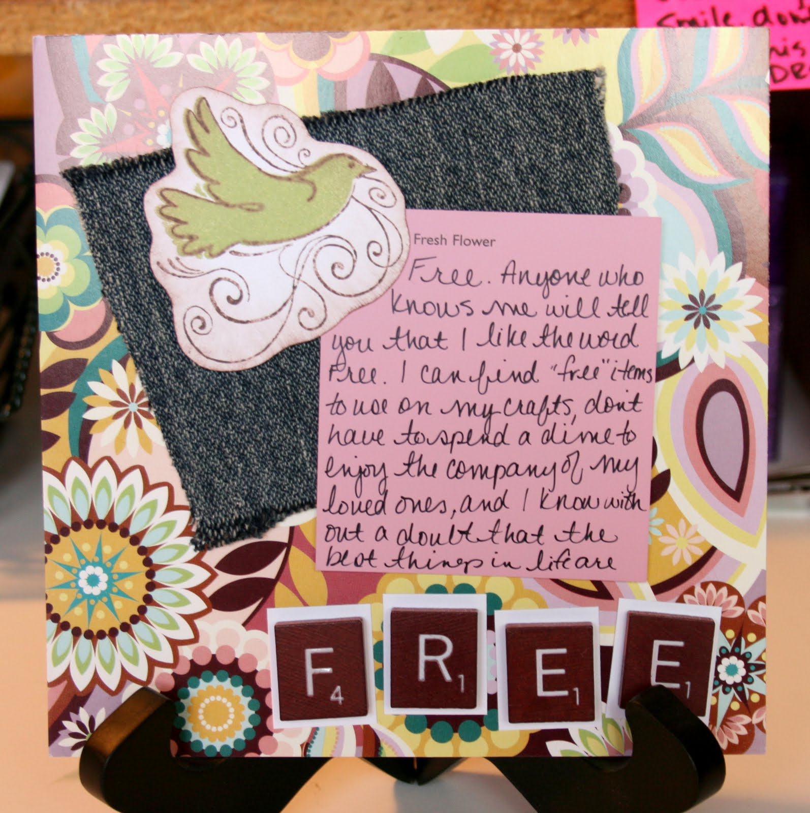 This page was more difficult than I imagined. Everything used to make this page was indeed FREE. No cost to me. The patterned paper was a gift, the scrabble tiles were from my mother who bought a scrabble game and found it was incomplete and gave me the pieces. The journal tag is actually a paint chip. The blue jean strip is from an old pair of jeans that I tore up because they were useless anyway. And the stamp was a prize I won at a crop a while back and I used white cardstock from my scraps pile. The only thing I actually paid for would be the ink :)